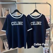 https://vogcopy.net/goods-115656.html 限定 セリーヌ Tシャツ 25SS新作 セリーヌロゴ刺繍 ネイビー×ホワイト配色カジュアル CELINE
